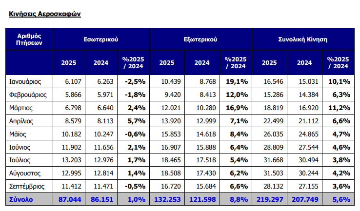 Ο αριθμός των πτήσεων στον Διεθνή Αερολιμένα Αθηνών κατά τη διάρκεια των εννέα πρώτων μηνών του 2025 ανήλθε σε 219.297, καταγράφοντας αύξηση της τάξης του 5,6% σε σχέση με το 2024.