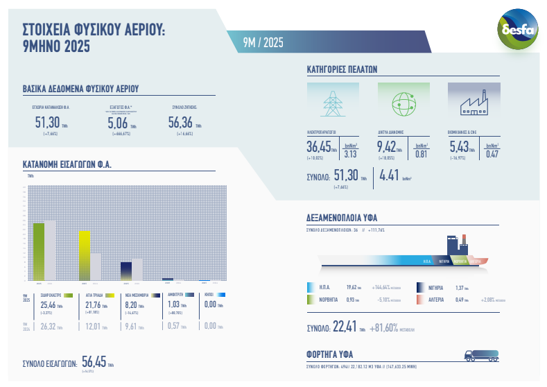 Τέλος, η υπηρεσία LNG Truck Loading του ΔΕΣΦΑ στον Τερματικό Σταθμό της Ρεβυθούσας κατέγραψε δυναμική ανάπτυξη, με τη φόρτωση 494 φορτηγών μεταφοράς LNG στο εννεάμηνο του 2025 έναντι 174 φορτηγών πέρυσι και την μεταφορά 148,05 GWh την ίδια χρονική περίοδο έναντι 51,28 GWh το 2024, καταγράφοντας τριπλασιασμό. Η δυναμική αύξηση των φορτίων επιβεβαιώνει ότι η υπηρεσία αναγνωρίζεται ως μια ευέλικτη και αποδοτική λύση για την κάλυψη ενεργειακών αναγκών απομακρυσμένων δικτύων διανομής και βιομηχανικών καταναλωτών στην Ελλάδα και την ευρύτερη περιοχή.