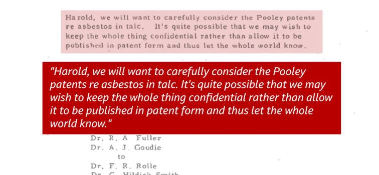 Την ίδια χρονιά, στελέχη της εταιρείας συζήτησαν την πιθανή αξία μιας πατέντας για μέθοδο απομάκρυνσης ινών αμιάντου από το τάλκ. Στο τέλος της επιστολής φέρεται να προστίθεται: «Ίσως να θέλουμε να κρατήσουμε το όλο θέμα εμπιστευτικό, αντί να το δημοσιεύσουμε σε μορφή πατέντας και να το μάθει όλος ο κόσμος».
