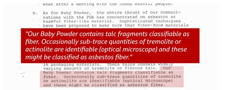 Ο ισχυρισμός ισχυρίζεται ότι η J&J είχε εντοπίσει αμίαντο στο προϊόν της ήδη από τη δεκαετία του 1960. Ένα εσωτερικό έγγραφο από το 1973 φέρεται να αναφέρει: «Η παιδική πούδρα μας περιέχει θραύσματα ταλκ που μπορούν να ταξινομηθούν ως ίνες. Περιστασιακά, είναι αναγνωρίσιμες και μικρότερες ποσότητες τρεμολίτη ή ακτινολίτη...»