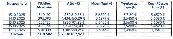 Στην αγορά 2.118.582 ιδίων μετοχών της που διαπραγματεύονται στο Χρηματιστήριο Αθηνών με μέση τιμή κτήσης 3,5486 ευρώ ανά μετοχή και συνολικό κόστος 7.518.019,92 ευρώ κατά το διάστημα 13/10/2025 – 17/10/2025 προχώρησε η Eurobank.