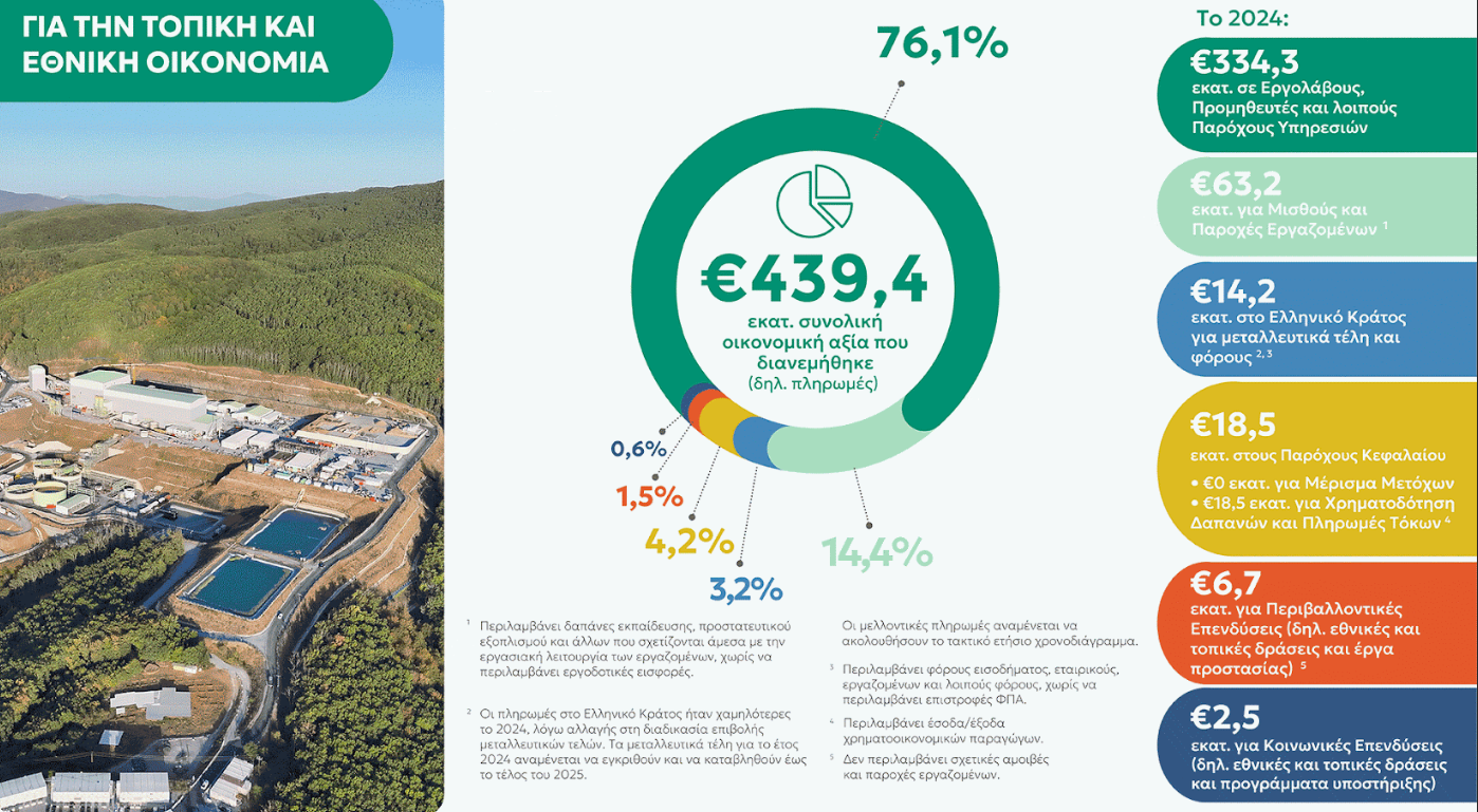 Συμβολή στην Οικονομία: Η συνολική οικονομική αξία, που διανεμήθηκε από την εταιρεία προς την Ελληνική οικονομία, ανήλθε σε 439 εκατ. ευρώ, ενισχύοντας ουσιαστικά την ανάπτυξη τόσο σε εθνικό, όσο και σε τοπικό επίπεδο. Από το ποσό αυτό, 334 εκατ. ευρώ διατέθηκαν σε εργολάβους και προμηθευτές, 63 εκατ. ευρώ σε μισθούς και παροχές εργαζομένων, ενώ 14 εκατ. ευρώ αποδόθηκαν σε φόρους και μεταλλευτικά τέλη προς το Ελληνικό Κράτος, εκ των οποίων 5,1 εκατ. ευρώ διατέθηκαν απευθείας στον Δήμο Αριστοτέλη μέσω μεταλλευτικών τελών (απορρέουν από τη δραστηριότητα του 2023), ενισχύοντας σημαντικά τα δημόσια έσοδα και τις αναπτυξιακές δυνατότητες της περιοχής.