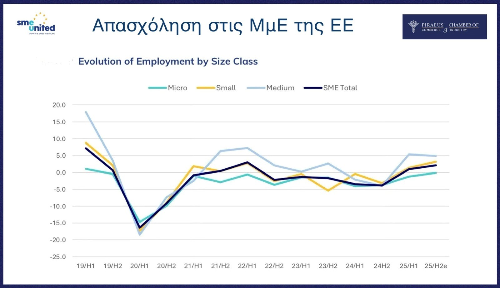 Ενώ η συνολική κατάσταση προβλέπεται να μειωθεί ελαφρώς, δείκτες όπως της απασχόλησης και του κύκλου εργασιών δείχνουν σημάδια δυναμικής. Οι εντάσεις στην αγορά εργασίας έχουν επίσης μειωθεί, με τα ποσοστά κενών θέσεων εργασίας να βρίσκονται στο χαμηλότερο επίπεδο τεσσάρων ετών. Στη δημιουργία θέσεων εργασίας, οι μεσαίες επιχειρήσεις ηγούνται της δημιουργίας θέσεων εργασίας, χάρη στην καλύτερη πρόσβαση στη χρηματοδότηση και τη μεγαλύτερη ανθεκτικότητα στις πιέσεις κόστους. Οι μικρές επιχειρήσεις σταδιακά καλύπτουν τη διαφορά, ενώ οι πολύ μικρές επιχειρήσεις παραμένουν ευάλωτες σε εξωτερικούς κραδασμούς.