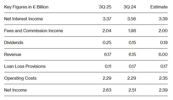 Τα έσοδα αυξήθηκαν κατά 0,3%, καθώς τα χαμηλότερα έσοδα από δανεισμό αντισταθμίστηκαν από τα υψηλότερα μερίσματα, τις προμήθειες και τα έσοδα από συναλλαγές. Οι νέες προβλέψεις για ληξιπρόθεσμα δάνεια μειώθηκαν στα 113 εκατ. ευρώ, ενώ οι λεγόμενες επικαλύψεις για πιθανές ζημίες ανήλθαν σε περίπου 1,7 δισ. ευρώ.