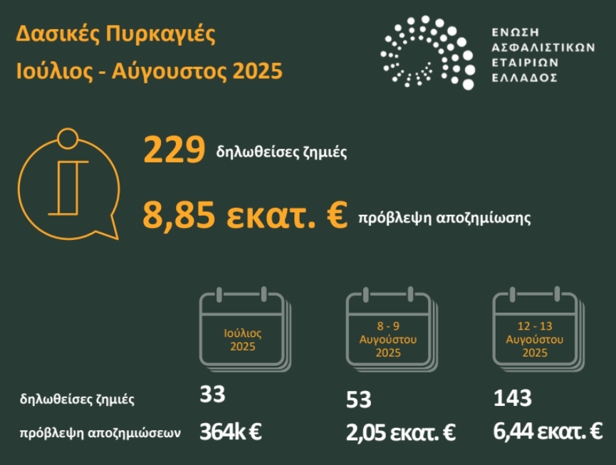 Σε 8,85 εκατ. ευρώ εκτιμώνται οι αποζημιώσεις των ασφαλιστικών επιχειρήσεων για τις δασικές πυρκαγιές το καλοκαίρι του 2025. Όπως αναφέρει ανακοίνωση, ολοκληρώθηκε η έρευνα της Ένωσης Ασφαλιστικών Εταιριών Ελλάδος (ΕΑΕΕ) για την πρώτη εκτίμηση των αποζημιώσεων της ελληνικής ασφαλιστικής αγοράς για τις ζημιές των ασφαλίσεων περιουσίας και αυτοκινήτων από τις δασικές πυρκαγιές που έπληξαν διάφορες περιοχές της χώρας το καλοκαίρι του 2025 (Ιούλιο και Αύγουστο).