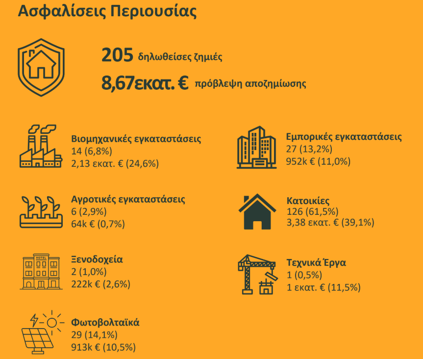 Σύμφωνα με τα στοιχεία των ασφαλιστικών επιχειρήσεων που συμμετείχαν στη σχετική έρευνα, αναφέρθηκαν συνολικά 229 ζημιές με το ύψος των αποζημιώσεων για αυτές να εκτιμάται συνολικά σε 8,85 εκατ. ευρώ. Από αυτές, 205 ζημιές αφορούσαν τις ασφαλίσεις περιουσίας (εκτίμηση αποζημιώσεων 8,67 εκατ. ευρώ) και 24 ζημιές τις ασφαλίσεις αυτοκινήτων (εκτίμηση 185.000 ευρώ).