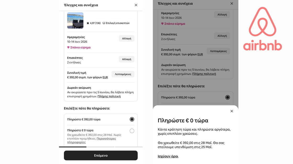 Η νέα επιλογή «Κάντε κράτηση τώρα, πληρώστε αργότερα» είναι διαθέσιμη για Έλληνες επισκέπτες που κάνουν κράτηση σε επιλεγμένα καταλύματα παγκοσμίως1, τα οποία ακολουθούν «μέτρια» ή «ευέλικτη» πολιτική ακύρωσης και τους επιτρέπει να μην καταβάλουν ολόκληρο το ποσό, παρά μόνο λίγο πριν από τη λήξη της περιόδου δωρεάν ακύρωσης. Οι πολιτικές ακύρωσης που επιλέγουν οι οικοδεσπότες παραμένουν αμετάβλητες. Η πληρωμή από τους επισκέπτες ολοκληρώνεται πάντα πριν από τη λήξη της δωρεάν περιόδου ακύρωσης, εξασφαλίζοντας πως οι οικοδεσπότες διαθέτουν τον απαραίτητο χρόνο για να προχωρήσουν σε νέα κράτηση σε περίπτωση ακύρωσης.