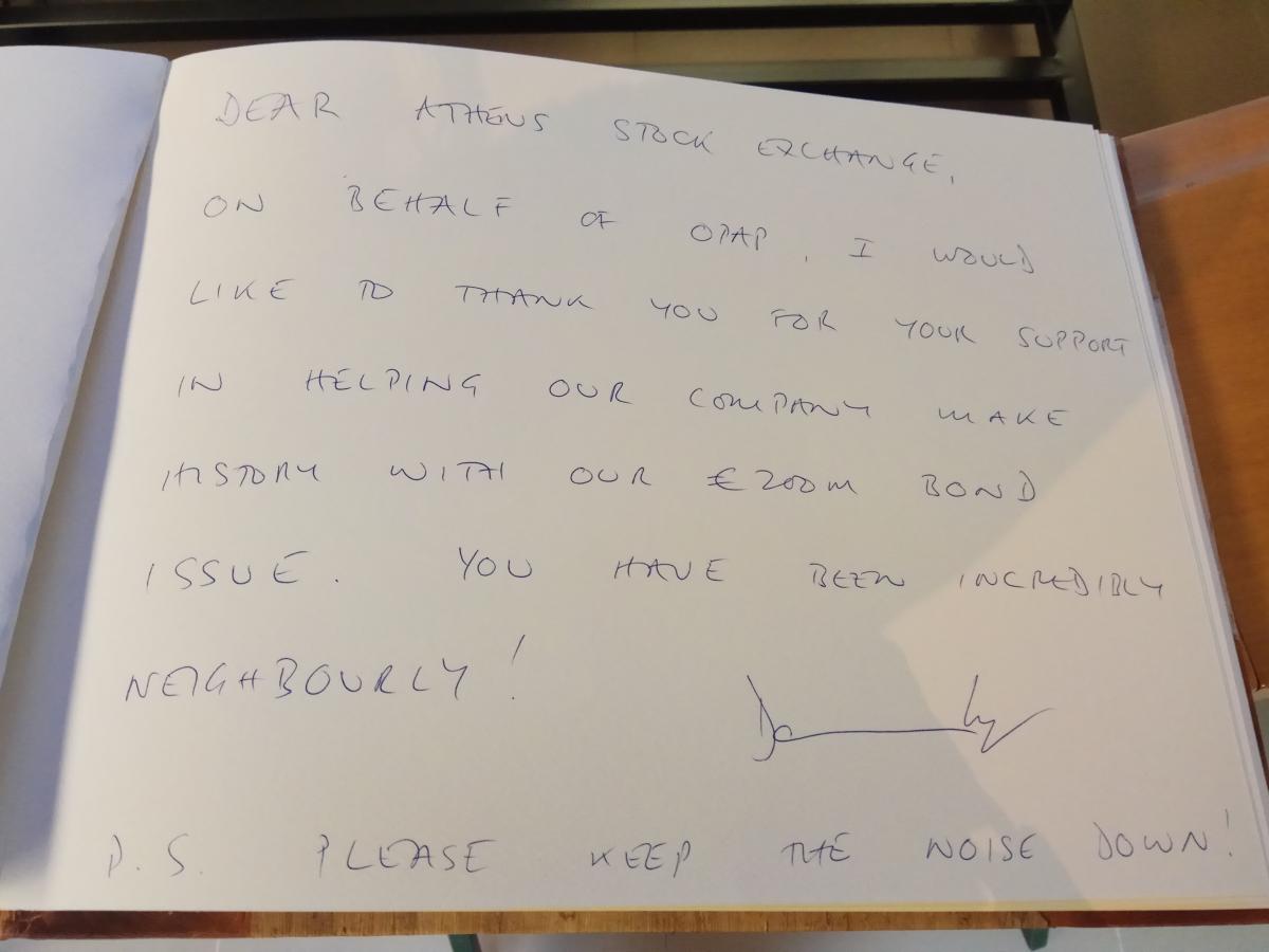Χτυπώντας το «καμπανάκι» της σημερινής συνεδρίασης, ο κ. Κόουπ υπογράμμισε ότι η θερμή ανταπόκριση των επενδυτών επιβεβαιώνει τα υψηλά επίπεδα εμπιστοσύνης του ελληνικού κοινού στον ΟΠΑΠ και το μακρόπνοο επενδυτικό σχέδιό του έως το 2020. Τα 200 εκατ. που συγκέντρωσε μέσω του ομολόγου, η εταιρεία θα τα διαθέσει κατά κύριο λόγο στην τεχνολογική αναβάθμιση και διεύρυνση του δικτύου πρακτορείων, καθώς και στην εισαγωγή νέων προϊόντων και υπηρεσιών.