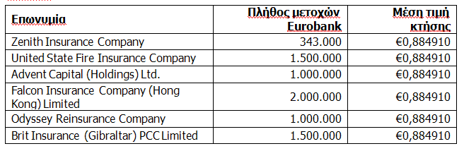 - στις 29.5.2015 οι κάτωθι θυγατρικές της Fairfax απέκτησαν τις ακόλουθες μετοχές της Eurobank: