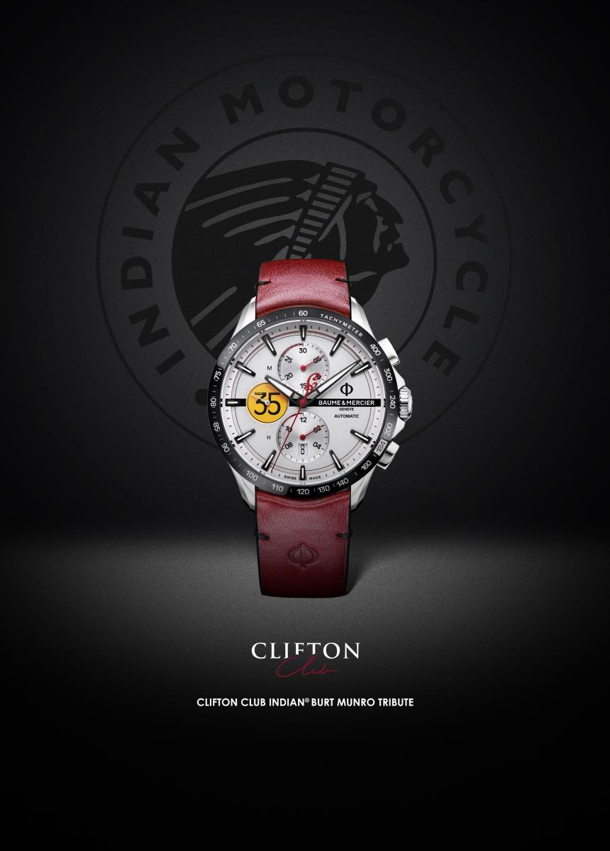 Το πρώτο μοντέλο της συλλογής που κυκλοφόρησε, είναι το Clifton Club Indian Burt Munro Tribute Limited Edition, ένας αυτόματος χρονογράφος που περιλαμβάνει ταχύμετρο, ένδειξη ωρών, λεπτών, δευτερολέπτων. Μια από τις ξεχωριστές λεπτομέρειες που είναι σχεδιασμένες για να τιμήσουν το αξιοσημείωτο κατόρθωμα του Munro, είναι ο μεγάλος κίτρινος αριθμός 35 στο μετρητή των δευτερολέπτων, που αποτελούσε το τυχερό νούμερο του μοτοσυκλετιστή. Το ασημένιο του καντράν θυμίζει την επιφάνεια των Bonneville Salt Flats, ενώ οι μετρητές πάνω του έχουν φτιαχτεί ακριβώς όπως τα ταχύμετρα, και η ταχύτητα-ρεκόρ των 184 μιλιών/ώρα επισημαίνεται πάνω στο ταχύμετρο. Το καντάν επίσης διαθέτει φωτεινούς δείκτες και μια οριζόντια μαύρη γραμμή, σαν εκείνη που είχε πάνω της η Indian Scout μοτοσυκλέτα του Munro. Επίσης βασικό χαρακτηριστικί είναι το logo της Indian, που υποδηλώνεται στυλάτα με το αρχικό ‘I’, το οποίο χρησιμέυει ως αντίβαρο στον κεντρικό κόκκινο δείκτη του χρονογράφου. Το δερμάτινο Horween λουρί του ρολογιού είναι σε απόχρωση Indian Red, ακριβώς ίδια με τη μοτοσυκλέτα του Νεοζηλανδού. To κομμάτι-αριστούργημα περιορίζεται στα 1967 κομμάτια, αριθμός που ανακαλεί τη χρονιά που ο Munro έκανε το ιστορικό του επίτευγμα.