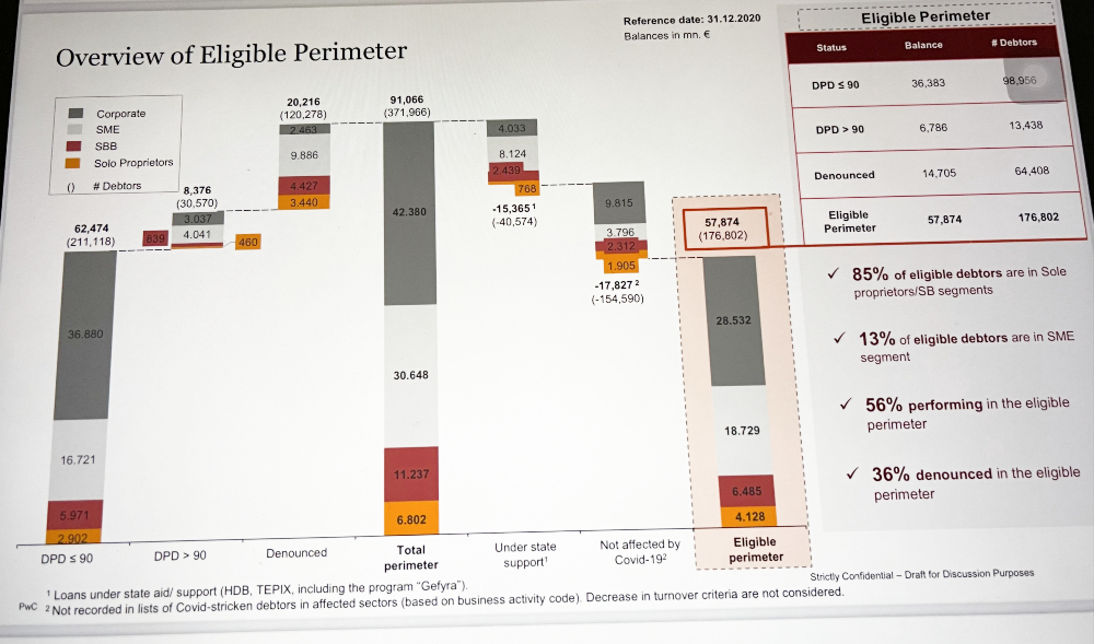Με βάση τη νέα πρόταση της PwC, το 85% των επιλέξιμων οφειλετών είναι ελεύθεροι επαγγελματίες και μικρές επιχειρήσεις, το 13% μικρομεσαίες επιχειρήσεις. Το 56% των δανείων της επιλέξιμης περιμέτρου είναι δάνεια εξυπηρετούμενα, ενώ ποσοστό 36% είναι δάνεια που έχουν καταγγελθεί.