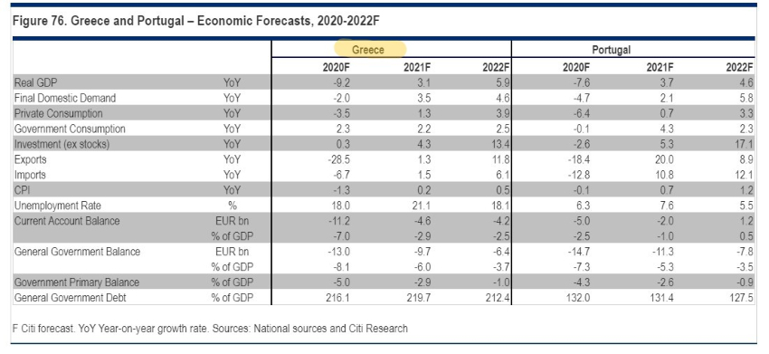 Σε ό,τι αφορά το Ταμείο Ανάκαμψης, η δυναμική του θα αποκρυσταλλωθεί γύρω από τα ποσοστά απορρόφησης των πόρων από τη χώρα, που σύμφωνα με τη Citi, θα είναι υψηλά και αυτό θα έχει σημαντική επίδραση στο ΑΕΠ από το 2021 έως το 2025. Ωστόσο οι μεσοπρόθεσμες προκλήσεις είναι αρκετές, με τη δυνητική ανάπτυξη της Ελλάδας να παραμένει αδύναμη λόγω των δημογραφικών στοιχείων και της ακόμη υποτονικής ανταγωνιστικότητας των εξαγωγών παρά τις προσπάθειες που έχουν γίνει στο μεταρρυθμιστικό τοπίο. Σε αυτό το σκέλος, οι ευρωπαϊκοί πόροι μπορούν να στηρίξουν στην περαιτέρω βελτίωση του επιχειρηματικού περιβάλλοντος στην Ελλάδα και να ενισχύσουν τις μεσοπρόθεσμες προοπτικές της οικονομίας.