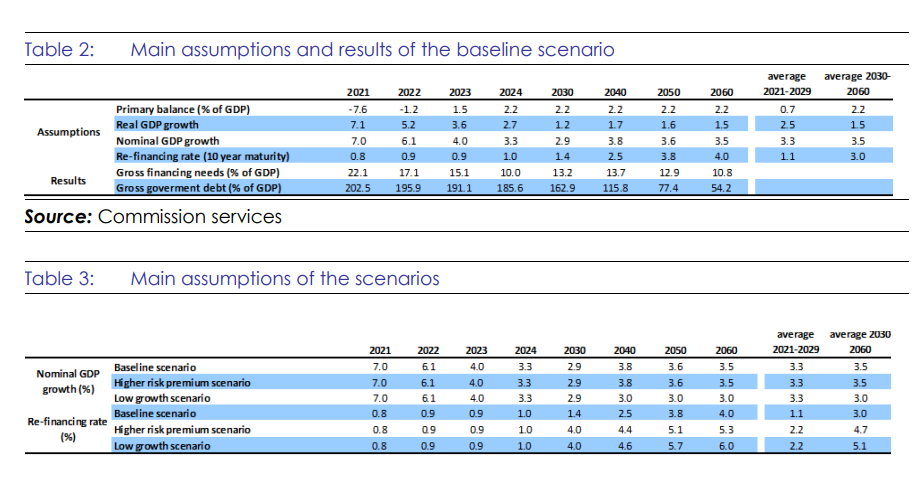 Στα κείμενα που ανακοινώθηκαν χθες περιλαμβάνεται, πέρα από την αποτίμηση της κατάστασης (με την έκθεση να έχει θετικό πρόσημο και να εισηγείται στο Eurogroup της 6ης Δεκεμβρίου την χορήγηση του επόμενου πακέτου δόσεων 767 εκατ. ευρώ) και ανάλυση βιωσιμότητας χρέους η οποία «φωτογραφίζει» ως βασικό σενάριο τη διαμόρφωση των πλεονασμάτων από το 2023 στο 2,2% του ΑΕΠ (σ.σ. όσο υπολόγιζε η συμφωνία του 2018), αλλά και την ανάπτυξη η οποία υπολογίζεται ότι θα φτάσει σε ρυθμό στο 5,2% το 2022, για να αρχίσει να επιβραδύνεται στη συνέχεια στο 3,6% το 2023 στο 2,7% το 2024 και κατά μέσο ορό στο 2,5% συνολικά τη δεκαετία και στο 1,5% μεσοπρόθεσμα.