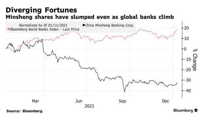 Πληγωμένη από τις αυξανόμενες απώλειες σε δάνεια προς developers, συμπεριλαμβανομένης της Evergrande, η μετοχή της Minsheng υποχώρησε 31% τους 12 μήνες έως την προηγούμενη εβδομάδα - τη χειρότερη επίδοση στον 155-μελή Bloomberg World Banks Index. Τα hedge funds και άλλοι short sellers είναι πιο bearish για την τράπεζα από οποιονδήποτε από τις ανταγωνίστριες της σε παγκόσμιο επίπεδο.