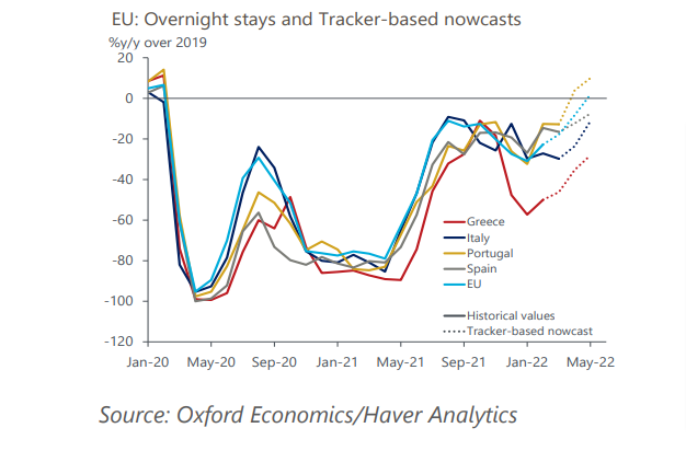 Γενικά, όλες οι τουριστικές χώρες της ΕΕ καταγράφουν σταθερή ανάκαμψη. Σύμφωνα με την Oxford Economics, η Ισπανία και η Πορτογαλία καταγράφουν διανυκτερεύσεις στα επίπεδα του 2019, η Ιταλία υπολείπεται 10% από τα προ πανδημίας επίπεδα, ενώ πιο πίσω βρίσκεται η Ελλάδα.