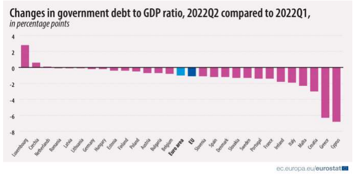 Αναφέρει πως το 2ο τρίμηνο του 2022 σε σύγκριση με το πρώτο τρίμηνο του 2022, τρία κράτη μέλη κατέγραψαν αύξηση στο λόγο του χρέους τους προς το ΑΕΠ στο τέλος του δεύτερου τριμήνου του 2022 και είκοσι τέσσερα μείωση. Αύξηση της αναλογίας παρατηρήθηκε στο Λουξεμβούργο (+2,8%), την Τσεχία (+0,6%) και την Ολλανδία (+0,1%), ενώ οι μεγαλύτερες μειώσεις καταγράφηκαν στην Κύπρο (-6,8%), στην Ελλάδα (-6,3%), στην Κροατία (-3,0%), στην Μάλτα (-2,3%), στην Ιταλία (-1,9%) και στην Ιρλανδία (-1,8%).