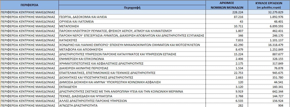 Αλλά και για την επιχειρηματική δραστηριότητα συνολικά, σύμφωνα με στοιχεία της ΕΛΣΤΑΤ για το έτος 2020, σε σύνολο 228.224 εταιρειών στην Περιφέρεια Κεντρικής Μακεδονίας καταγράφηκε τζίρος 32.279.829 ευρώ. Για την αντιστοιχία, 354.849 εταιρείες στην Αττική «παρήγαγαν» τζίρο 185.620.512 ευρώ. Η «τρομακτική» δυσαναλογία δείχνει πως κατά μέσο όρο μία εταιρεία στην Κεντρική Μακεδονία «τζιράρει» 141 ευρώ, ενώ στην Αττική 523 ευρώ.