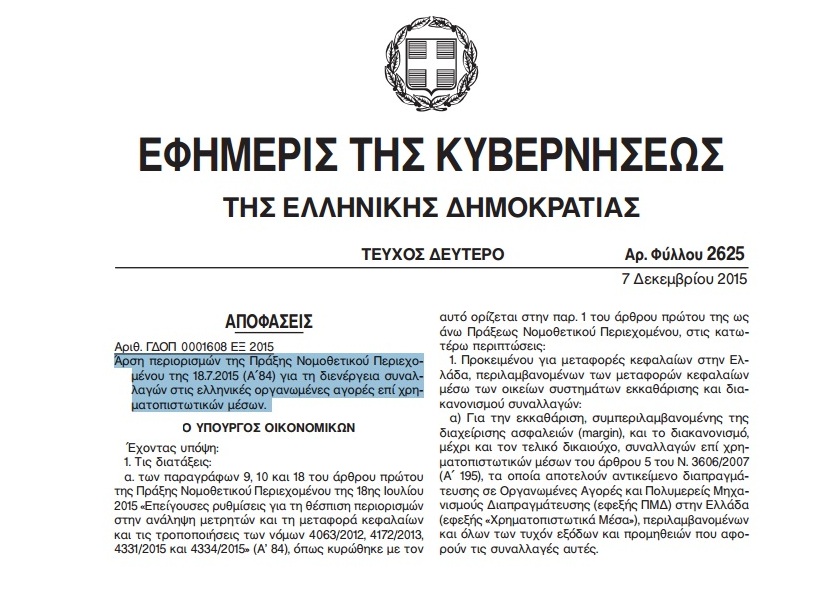 Η απόφαση του κ. Τσακαλώτου ξεκαθαρίζει πως το προϊόν εκκαθάρισης και διακανονισμού συναλλαγών επί χρηματοπιστωτικών μέσων, καθώς και το ποσό των χρηματικών διανομών δύναται να πιστώνεται σε τραπεζικό λογαριασμό μέχρι και του τελικού δικαιούχου και εκτός του ελληνικού τραπεζικού συστήματος, εφόσον μέσω του λογαριασμού αυτού γινόταν η εκκαθάριση και ο διακανονισμός των συναλλαγών, του οικείου επενδυτικού λογαριασμού πριν από την έναρξη της τραπεζικής αργίας της 28ης Ιουνίου 2015.