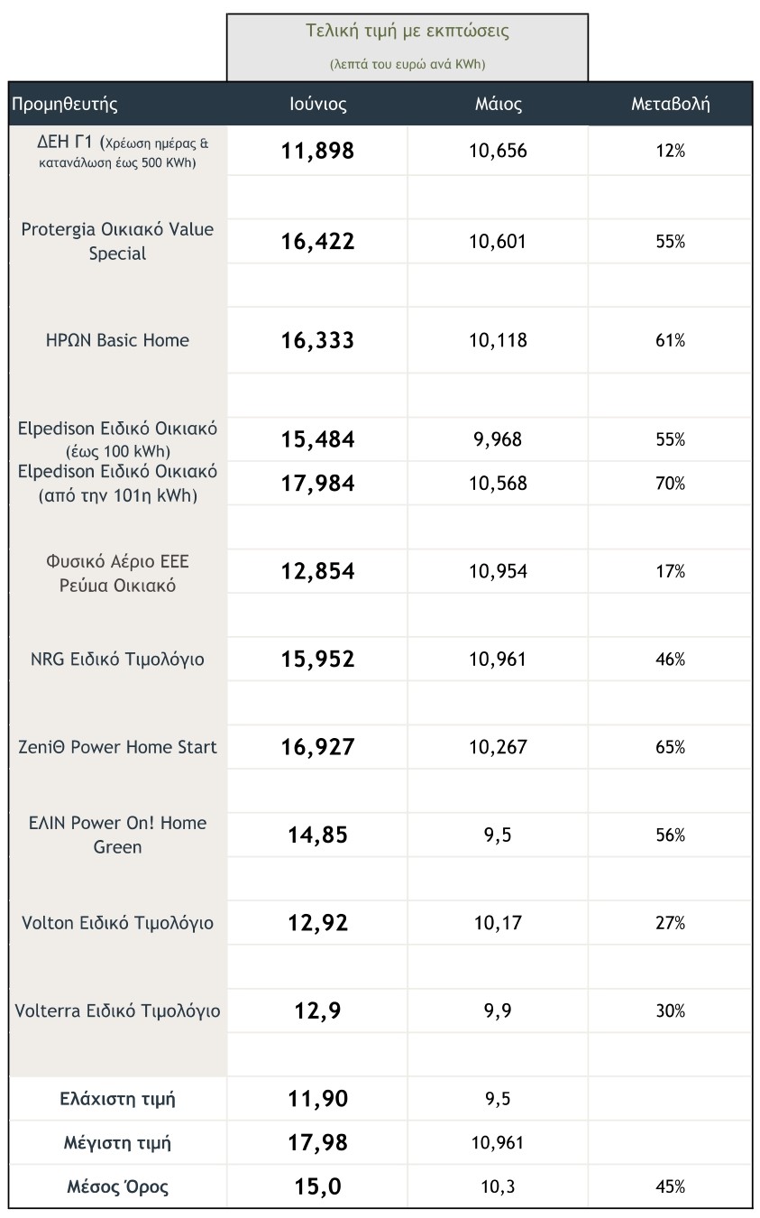 Η αύξηση ανέρχεται στο 27%, σε σχέση με τον προηγούμενο μήνα. Χωρίς την έκπτωση συνέπειας, η χρέωση είναι τον Ιούνιο 16,884 λεπτά ανά κιλοβατώρα.