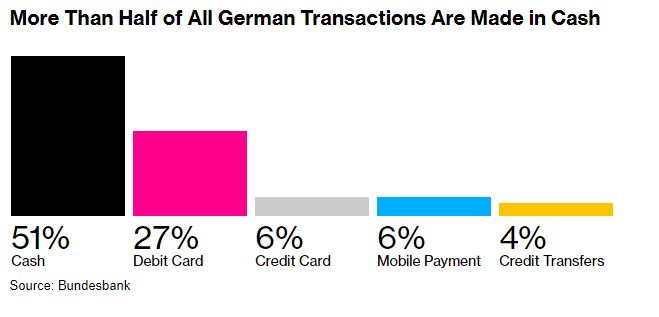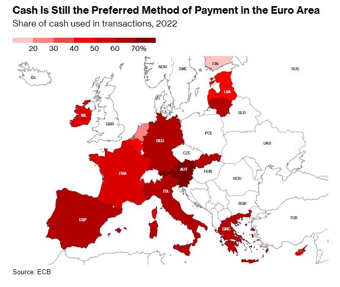 Ωστόσο, δεν είναι μόνο οι Γερμανοί - των οποίων οι πληρωμές με κάρτα αυξάνονται σταθερά - που πρέπει να πείσει. Χώρες όπως η Αυστρία, η Σλοβακία και η Μάλτα εκφράζουν ακόμα πιο έντονα την προτίμησή τους στα μετρητά, ακόμη και όταν οι Ολλανδοί τα αποφεύγουν σχεδόν εξ ολοκλήρου για χάρη των ψηφιακών λύσεων.
