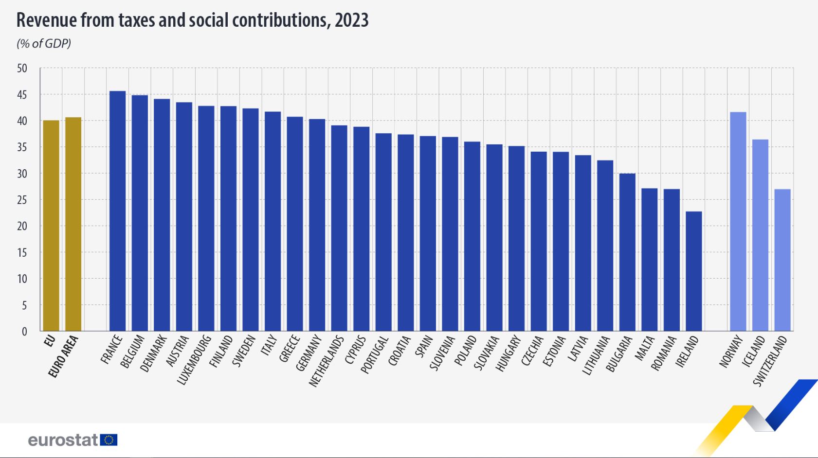 Οι υψηλότεροι φόροι και ασφαλιστικές εισφορές ως ποσοστό του ΑΕΠ καταγράφονται στη Γαλλία (45,6%), το Βέλγιο (44,8%) και τη Δανία (44,1%), ενώ τα χαμηλότερα ποσοστά εμφανίζουν η Ιρλανδία (22,7%), η Ρουμανία (27%) και η Μάλτα (27,1%). Το χαμηλότερο φορτίου κουβαλούν στα ΑΕΠ τους η Ιρλανδία (22,7%), η Ρουμανία (27%) και η Μάλτα (27,1%).