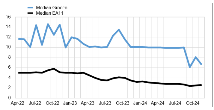 Η προσοχή πλέον στρέφεται στον δομικό πληθωρισμό καθώς οι ανατιμήσεις στις υπηρεσίες συνεχίζονται ταχύτερα από την υπόλοιπη Ευρωζώνη, ενώ τα μηνύματα που έρχονται από τη βιομηχανία προϊδεάζουν για νέες ανοδικές πιέσεις στα βιομηχανικά αγαθά.