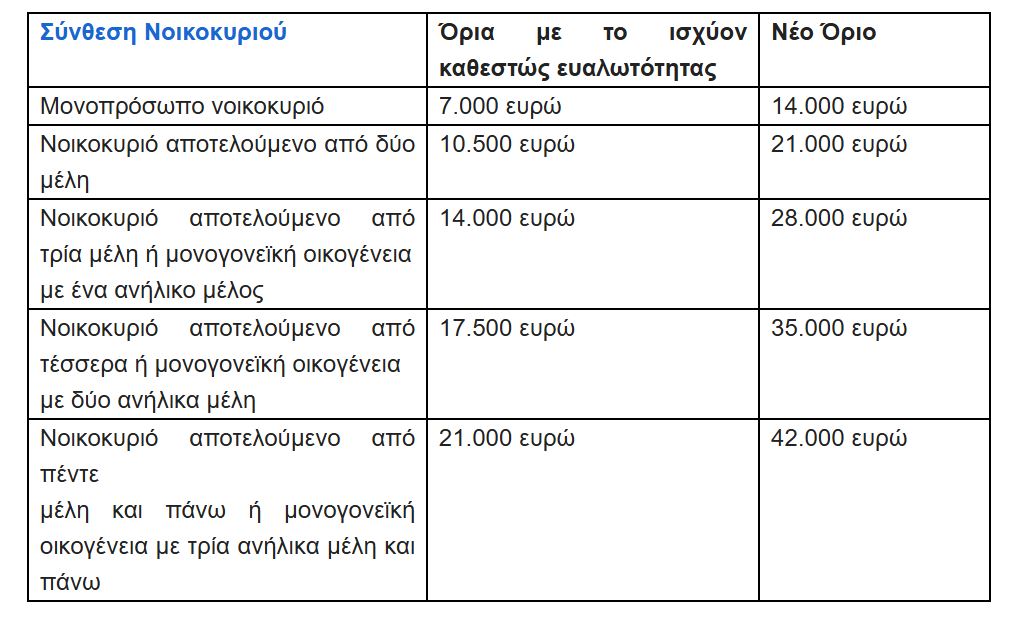 1) Αύξηση των εισοδηματικών και περιουσιακών ορίων προκειμένου να χαρακτηριστεί ένας οφειλέτης ως επιλέξιμος στο πλαίσιο της υποχρεωτικής αποδοχής του εξωδικαστικού μηχανισμού από τους πιστωτές. Με τη ρύθμιση που εισάγεται, διπλασιάζονται τα κριτήρια για το χαρακτηρισμό δανειολήπτη ως επιλέξιμου προκειμένου να καταστεί υποχρεωτική η συναίνεση του συνόλου των πιστωτών για ένταξη του οφειλέτη στον εξωδικαστικό μηχανισμό. Ο διπλασιασμός των ορίων αυτών έχει ως προϋπόθεση ο οφειλέτης να έχει ανώτατο όριο ήδη μη εξυπηρετούμενων τραπεζικών οφειλών (δηλαδή σε τράπεζες ή servicers) τις 300.000 ευρώ.