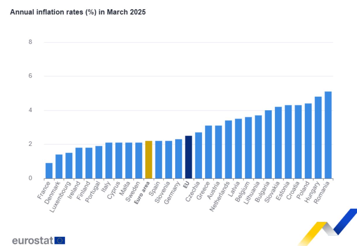 Η Eurostat αναφέρει πως ο χαμηλότερος ρυθμός αύξησης τιμών καταγράφηκε στη Γαλλία (0,9%), τη Δανία (1,4%) και το Λουξεμβούργο (1,5%). Αντιθέτως, πιο γρήγορα «έτρεξε» ο πληθωρισμός στη Ρουμανία (5,1%), την Ουγγαρία (4,8%) και την Πολωνία (4,4%). Σε σύγκριση με τον Φεβρουάριο του 2024, ο ετήσιος πληθωρισμός έκοψε ταχύτητα σε 16 κράτη μέλη της ΕΕ, παρέμεινε σταθερός σε 1 και επιτάχυνε σε 10.