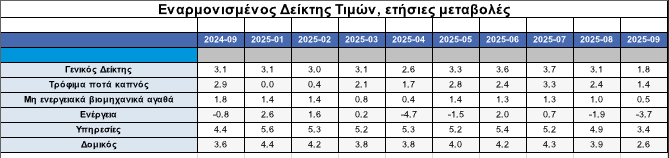 Καθώς ωστόσο ο κλάδος της ενέργειας ήταν ο βασικός λόγος για την μεγάλη αυτή επιβράδυνση της ανόδου των τιμών τον Σεπτέμβριο (μαζί με επίπτωση βάσης στην σύγκριση που γίνεται με το 2024 σε κάποιους δείκτες), ο δομικός δείκτης (που εξαιρεί ενέργεια και τρόφιμα), επιβραδύνθηκε μεν, αλλά παραμένει σε υψηλότερα επίπεδα από τον γενικό δείκτη: σημείωσε άνοδο 2,6% έναντι ανόδου 3,9% τον Αύγουστο. Τα τελικά στοιχεία θα ανακοινωθούν από την ΕΛΣΤΑΤ στις 9 Οκτωβρίου.