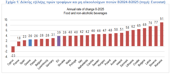 Ο πληθωρισμός τροφίμων στην Ελλάδα ήταν τον Αύγουστο του 2025 ο τέταρτος χαμηλότερος στην ΕΕ των 27, όπως προκύπτει από την ανάλυση στοιχείων της Eurostat στην οποία προχώρησε το Ινστιτούτο Έρευνας Λιανεμπορίου Καταναλωτικών Αγαθών (ΙΕΛΚΑ), παρακολουθώντας τις πληθωριστικές τάσεις στα τρόφιμα το 2025.