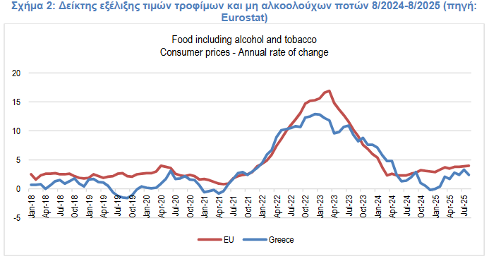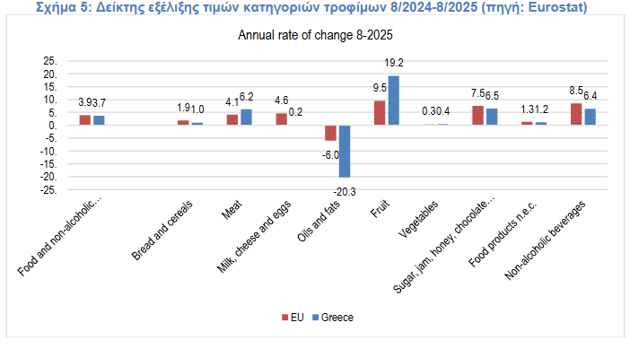 Οι μόνες περιόδους στις οποίες φαίνεται ότι η Ελλάδα καταγράφει μεγαλύτερες πληθωριστικές πιέσεις στα τρόφιμα από την Ευρωπαϊκή Ένωση, είναι η περίοδος από τον Ιανουάριο έως τον Ιούνιο 2022 και από τον Οκτώβριο 2023 έως τον Ιούνιο 2024, πρόκειται για την περίοδο ανατιμήσεων στο ελαιόλαδο, το οποίο στο ελληνικό καλάθι έχει πολύ μεγαλύτερη αναλογικά βαρύτητα. Από τον Οκτώβριο 2024 μέχρι σήμερα καταγράφονται χαμηλότεροι δείκτες στην Ελλάδα σε σχέση με την Ευρωπαϊκή Ένωση.