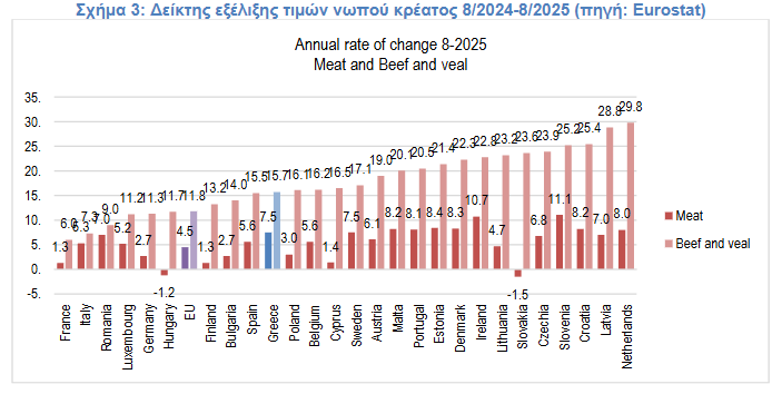 Όσον αφορά συγκεκριμένα την τιμή του νωπού κρέατος και την τιμή νωπού βόειου κρέατος, στην Ελλάδα καταγράφεται πληθωρισμός 7,5% για το νωπό κρέας και 15,7% για το νωπό βόειο κρέας. Αν και οι τιμές αυτές είναι υψηλότερες από τον ευρωπαϊκό μέσο όρο, 4,5% και 11,8% αντίστοιχα, η Ελλάδα καταγράφει μία από τις χαμηλότερες επιδόσεις συγκριτικά με τις άλλες χώρες στο νωπό βόειο κρέας και βρίσκεται στην 10η θέση. Η Γαλλία καταγράφει την χαμηλότερη αύξηση με 6% ενώ η Ολλανδία την υψηλότερη αύξηση με 29,8%.