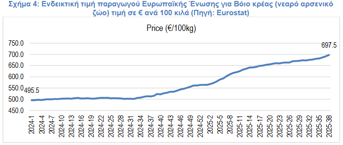 - Μεταβολές στις εμπορικές ροές. Οι εξαγωγές βόειου κρέατος της ΕΕ έχουν αυξηθεί (ιδίως προς χώρες όπως η Τουρκία και η Αλγερία), ενώ η αύξηση των εισαγωγών παραμένει σχετικά περιορισμένη. Αυτό συμβάλλει στη διατήρηση υψηλών τιμών στην εσωτερική αγορά.