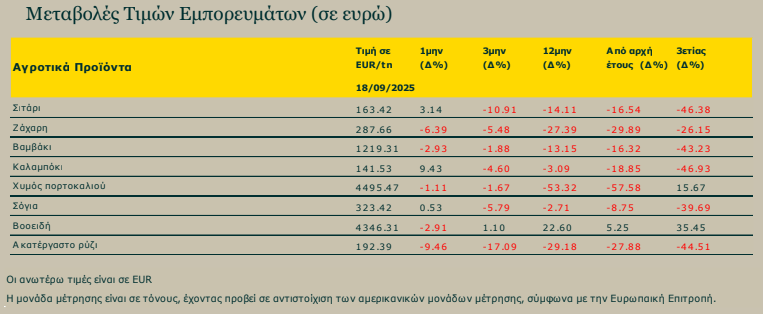 Σε μηνιαίο επίπεδο, τον Σεπτέμβριο 2025, ο δείκτης των αγροτικών προϊόντων κινήθηκε ανοδικά (1,47%) για δεύτερο συνεχόμενο μήνα, ενώ μεγαλύτερη ήταν η ενίσχυση στον δείκτη εμπορευμάτων (+3,21%). Ως πιθανοί λόγοι της απόκλισης μπορεί να αναφερθούν η υπερβάλλουσα ζήτηση, η υποχώρηση του δολαρίου και η απουσία εντάσεων στις διεθνείς εμπορικές σχέσεις συμβάλλοντας θετικά στη διατήρηση της σταθερότητας στην αγορά, με την τεχνική εικόνα του δείκτη να παραμένει σχετικά αρνητική.