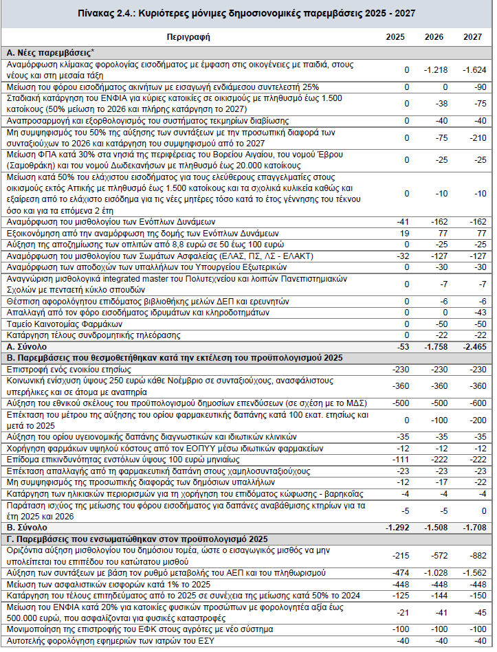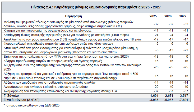 Σύμφωνα με το ΥΠΕΘΟ, οι δημοσιονομικές παρεμβάσεις για το 2026 περιλαμβάνουν μία σειρά από φορολογικές και μισθολογικές μεταρρυθμίσεις με κύριο στόχο την ενίσχυση του εισοδήματος και τη μείωση των φορολογικών βαρών, ιδιαίτερα για τη μεσαία τάξη, τις οικογένειες με παιδιά και τους νέους.