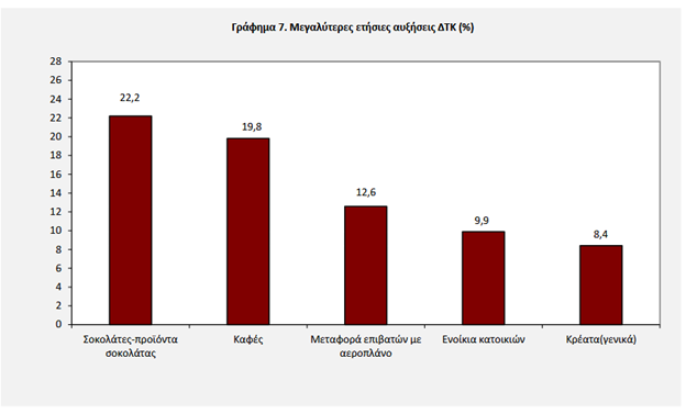 Τις μεγαλύτερες αυξήσεις τιμών σε σχέση με ένα χρόνο πριν εμφανίζουν: οι σοκολάτες (22,2%), ο καφές (19,8%), τα εισιτήρια αεροπλάνων (12,6%), τα ενοίκια κατοικιών (9,9%) και τα κρέατα (8,4%).