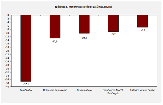 Από την άλλη τις μεγαλύτερες ετήσιες μειώσεις τιμών καταγράφουν: Το ελαιόλαδο (-37,1%), το πετρέλαιο θέρμανσης (-12,9%), το φυσικό αέριο (-10,2%), τα ξενοδοχεία (-9,2%) και οι σάλτσες-καρυκεύματα (-6,8%).
