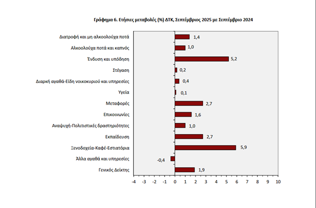 Ξενοδοχεία-Καφέ-Εστιατόρια με ετήσια άνοδο 5,9% λόγω αύξησης κυρίως των τιμών στα εστιατόρια-ζαχαροπλαστεία-καφενεία- κυλικεία. Μέρος της αύξησης αυτής αντισταθμίστηκε από τη μείωση κυρίως των τιμών σε ξενοδοχεία-μοτέλ-πανδοχεία.