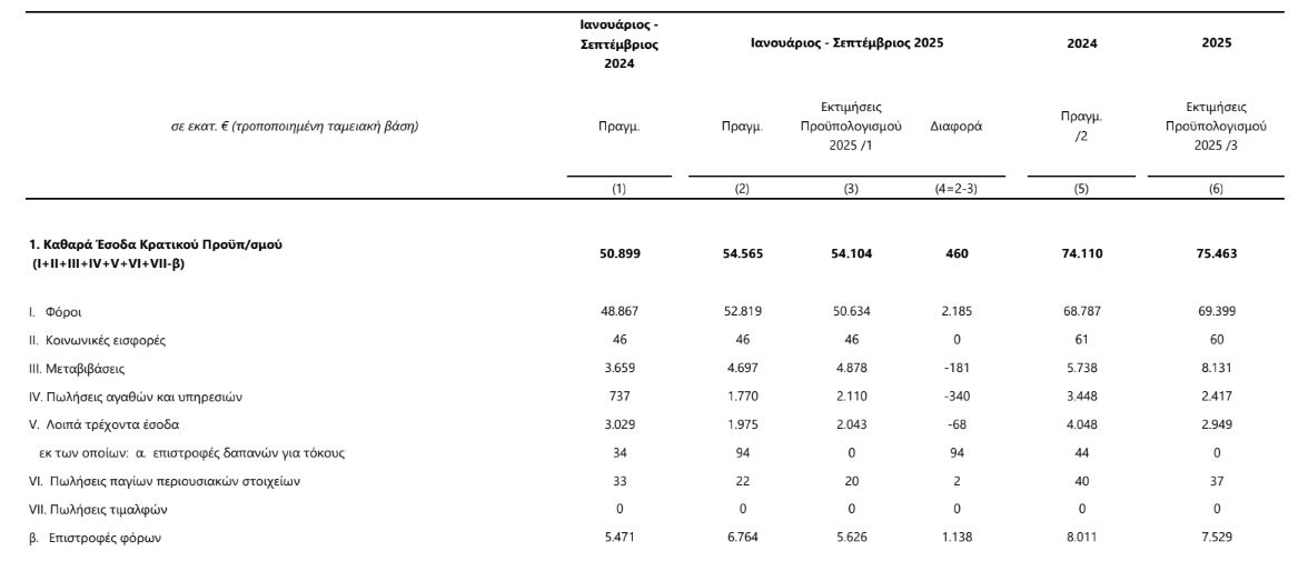 Τον Σεπτέμβριο 2025, τα καθαρά έσοδα του κρατικού προϋπολογισμού ανήλθαν σε 6,107 δισ. ευρώ, αυξημένα κατά 277 εκατ. ευρώ έναντι του μηνιαίου στόχου. Τα έσοδα από φόρους διαμορφώθηκαν σε 6,3 δισ. ευρώ, αυξημένα κατά 144 εκατ. ευρώ ή 2,3%. Σημειώνεται ότι μέρος του φόρου εισοδήματος εισπράχθηκε εμπροσθοβαρώς τους προηγούμενους μήνες, λόγω του ότι τέθηκε σε λειτουργία ήδη από τα μέσα Μαρτίου η εφαρμογή για την υποβολή των φορολογικών δηλώσεων.