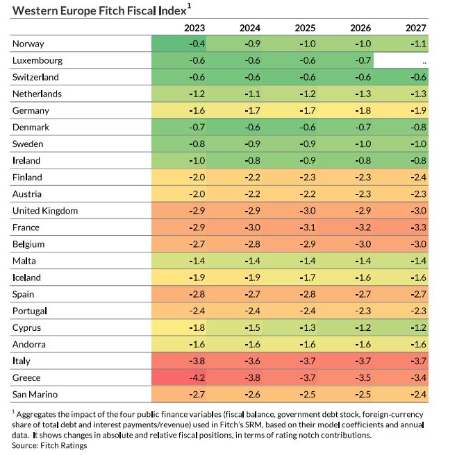 Ο οίκος χρησιμοποιεί έναν σύνθετο δείκτη, τον Fitch Fiscal Index, για να αποτυπώσει τη συνολική δημοσιονομική εικόνα κάθε χώρας. Η «βαθμολογία» για κάθε χώρα προκύπτει από τέσσερις βασικές μεταβλητές: το δημοσιονομικό ισοζύγιο, το ύψος του δημόσιου χρέους, το ποσοστό του χρέους σε ξένο νόμισμα και το κόστος εξυπηρέτησης του χρέους. Με βάση αυτόν τον δείκτη, αρκετές δυτικοευρωπαϊκές χώρες αναμένεται να δουν τη δημοσιονομική τους θέση να επιδεινώνεται έως το 2027. Η Νορβηγία, για παράδειγμα, θα δει τον δείκτη της να υποχωρεί από -0,4 το 2023 σε -1,1 το 2027, η Φινλανδία από -2,0 σε -2,4, ενώ η Γαλλία από -2,9 σε -3,3.