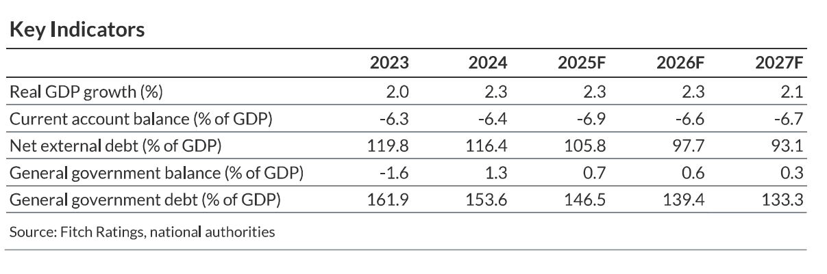 Αν και ο λόγος χρέους προς ΑΕΠ εκτιμάται ότι ήταν στο 148% στα μέσα του 2025, σχεδόν τριπλάσιος από τον μέσο όρο των χωρών με αξιολόγηση “BBB", είναι κατά 50 ποσοστιαίες μονάδες χαμηλότερος από το 2020. Τα ταμειακά διαθέσιμα ανέρχονται στο 16% του ΑΕΠ και καλύπτουν λήξεις για τα επόμενα τρία χρόνια, επισημαίνουν μεταξύ άλλων οι αναλυτές της Fitch και προβλέπουν συνέχιση της ταχείας αποκλιμάκωσης του λόγου χρέους/ΑΕΠ.