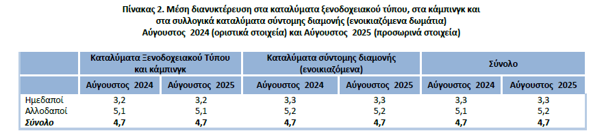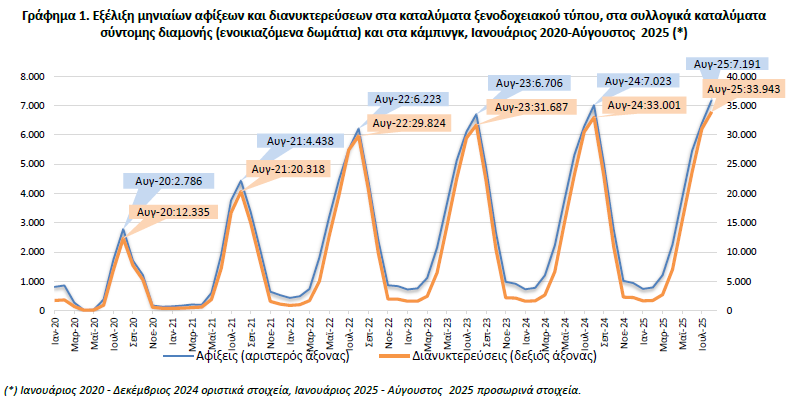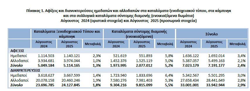 Τον Αύγουστο 2025 σε σύγκριση με τον αντίστοιχο μήνα του 2024, παρατηρήθηκε αύξηση 2,1% στις αφίξεις και 2,8% στις διανυκτερεύσεις των αλλοδαπών. Αντίστοιχα για τους ημεδαπούς, παρατηρήθηκε αύξηση στις αφίξεις και στις διανυκτερεύσεις κατά 3,4% και 3,0%, αντίστοιχα.