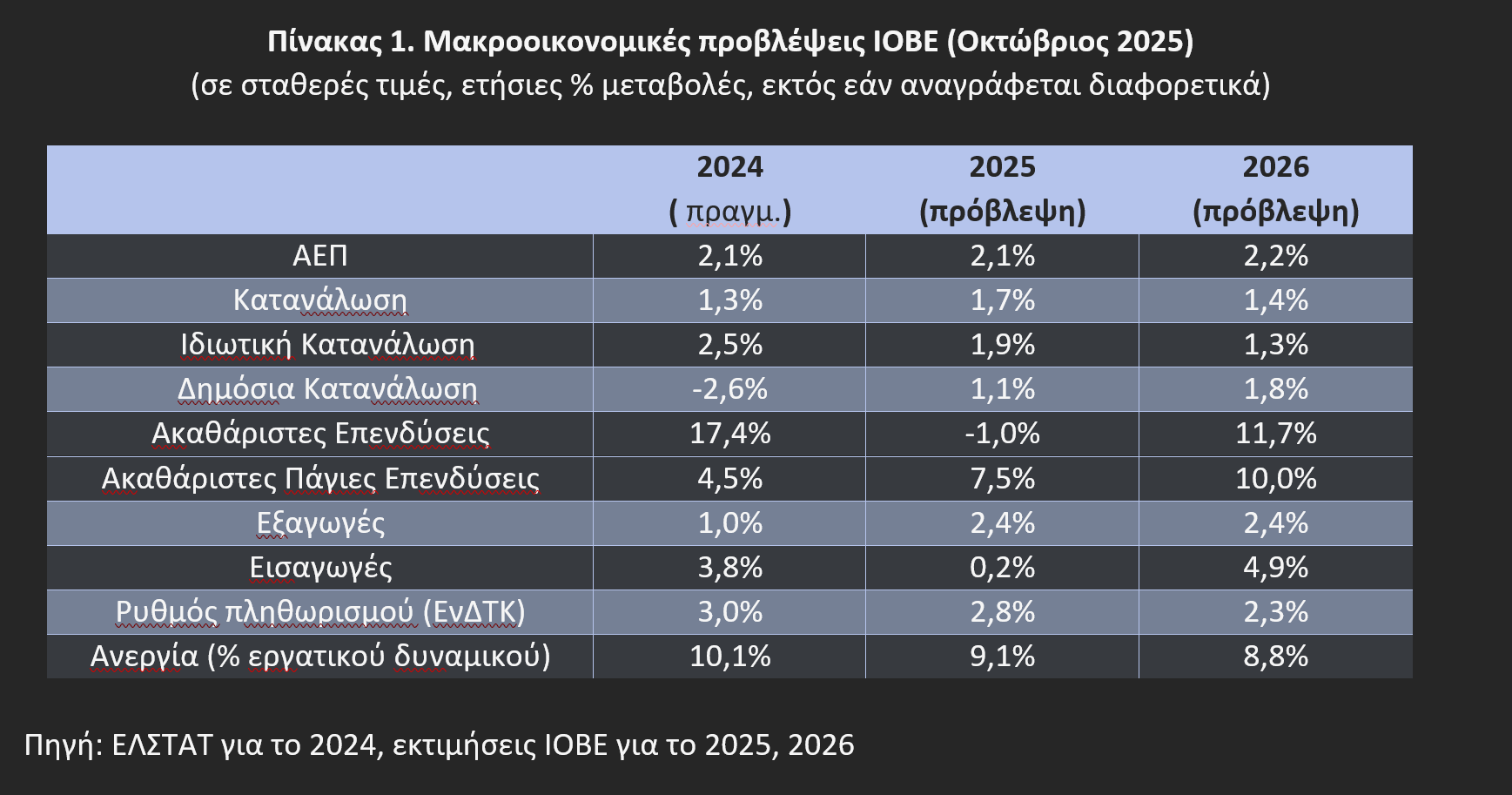 Για το 2026, το ΙΟΒΕ αναθεωρεί προς τα κάτω την εκτίμησή του για ανάπτυξη στο +2,2% (από 2,4%). Αναφορικά με τις συνιστώσες, αναμένουμε διατήρηση της αναπτυξιακής δυναμικής της κατανάλωσης, με ηπιότερο όμως βαθμό καθώς παρά την αξιοσημείωτη αύξηση της δημόσιας κατανάλωσης (+1,8%), η ιδιωτική κατανάλωση προβλέπεται να επιβραδυνθεί σημαντικά (+1,3%). Οι πάγιες επενδύσεις (+10,0%) αναμένεται να ωφεληθούν από ευνοϊκές συνθήκες όπως η επιτάχυνση της υλοποίησης του ΤΑΑ, το χαμηλότερο κόστος χρήματος, και η χρήση των πόρων του ιστορικά υψηλού Προγράμματος Δημοσίων Επενδύσεων. Ωστόσο, ελλοχεύουν κίνδυνοι οι οποίοι απορρέουν από το εξωτερικό περιβάλλον. Το εξωτερικό έλλειμμα, το οποίο ενέχει και διαρθρωτικά χαρακτηριστικά, αναμένεται να διευρυνθεί (εισαγωγές +4,9%, εξαγωγές +2,4%), κυρίως λόγω μιας σειράς διεθνών αβεβαιοτήτων όπως η ενδεχόμενη κλιμάκωση του εμπορικού πολέμου, η πιθανή υποχώρηση της ισοτιμίας ευρώ/δολαρίου λόγω πολιτικοκοινωνικών αναταράξεων σε χώρες του πυρήνα της Ευρωζώνης (όπως η Γαλλία), και η αναστολή της πτωτικής πορείας των επιτοκίων.