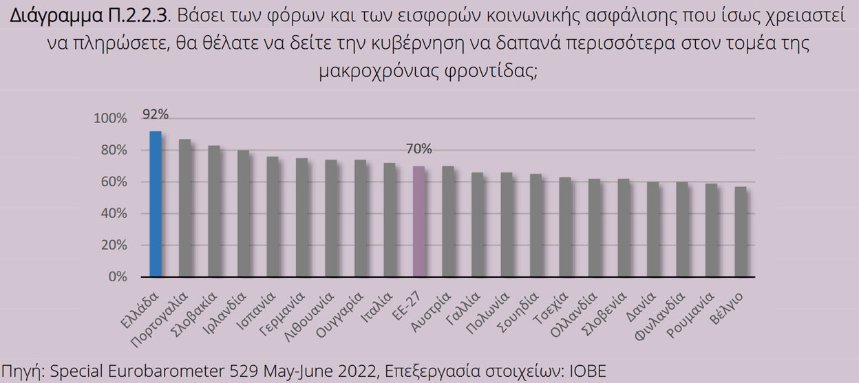 Και όλα αυτά όταν είναι σχεδόν καθολικό αίτημα η αύξηση των δαπανών. Σύμφωνα με συγκριτική μελέτη μεταξύ των χωρών μελών της ΕΕ που εμβαθύνει στις τάσεις και πολιτικές στην εν λόγω θεματική η συντριπτική πλειοψηφία των Ελλήνων (92%, που αποτελεί το υψηλότερο ποσοστό στην ΕΕ) επιθυμεί την σημαντική αύξηση των δαπανών μακροχρόνιας φροντίδας.