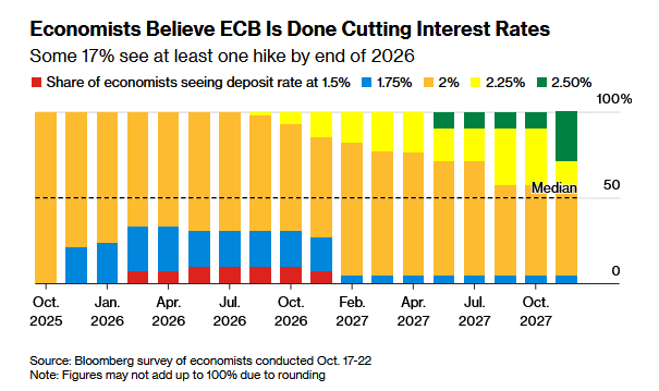 Σταθερό στο 2% αναμένεται να κρατήσει το κόστος δανεισμού στην Ευρωζώνη η Ευρωπαϊκή Κεντρική Τράπεζα έως το 2027, σύμφωνα με έρευνα του Bloomberg μεταξύ οικονομολόγων.