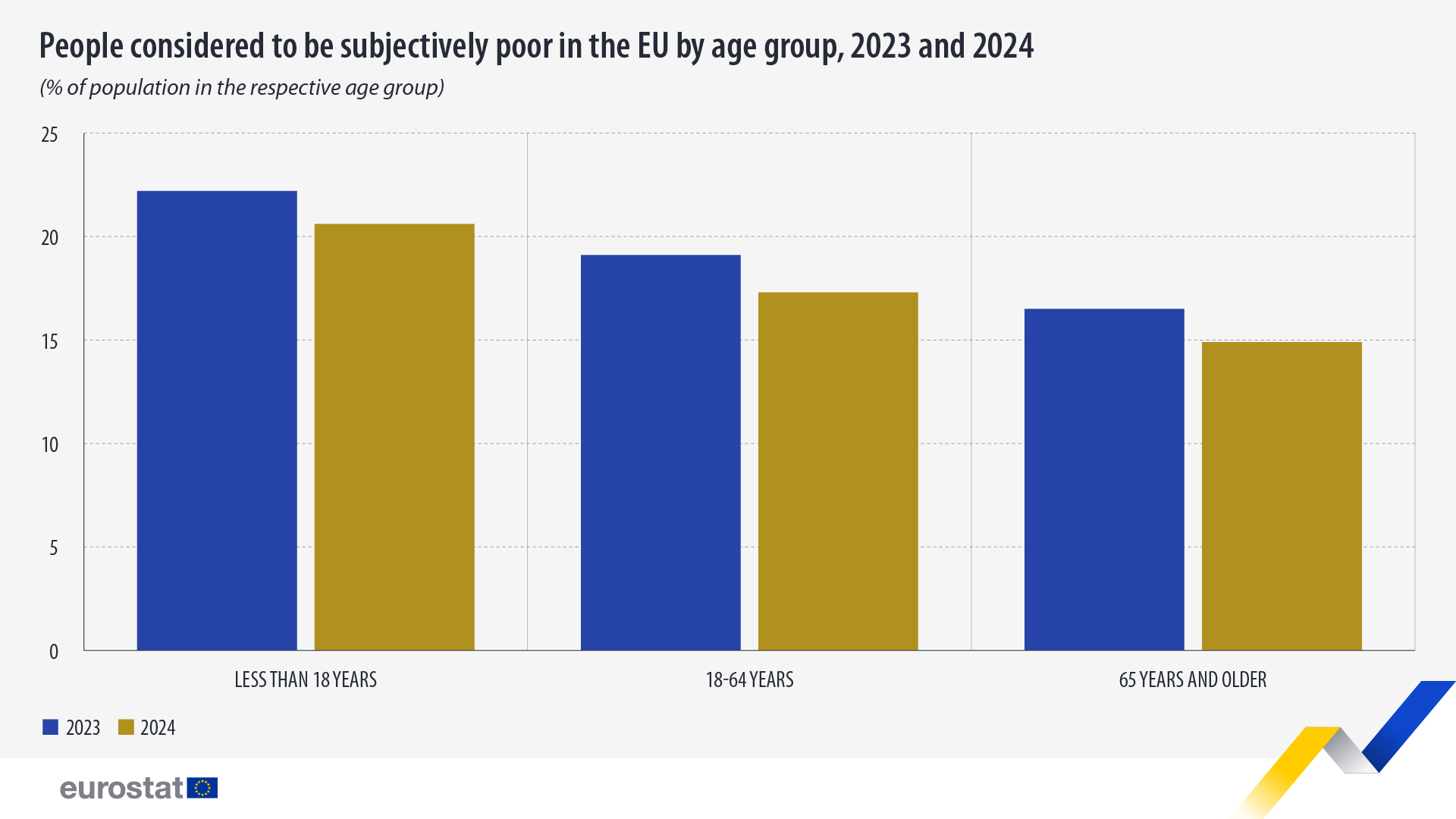 Παράλληλα, παρατηρήθηκε πτώση του ποσοστού υποκειμενικής φτώχειας σε όλες τις ηλικιακές κατηγορίες: Το υψηλότερο ποσοστό καταγράφεται σε παιδιά τους εφήβους κάτω των 18 ετών, όπου 1 στους 5 (20,6%) δηλώνει ότι ζει υπό οικονομική πίεση. Στους 18–64 ετών, πιάνει το 17,3%, ενώ στους άνω των 65 ετών περιορίστηκε στο 14,9%.