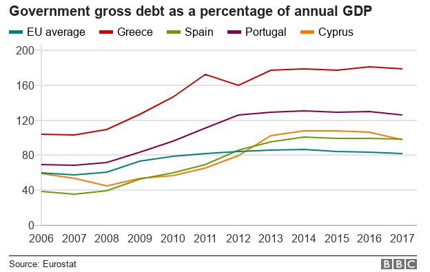 Σχήμα 1: Ποσοστό του χρέους προς το ετήσιο ΑΕΠ [Μέσος όρος ΕΕ, Ελλάδα, Ισπανία, Πορτογαλία, Κύπρος]