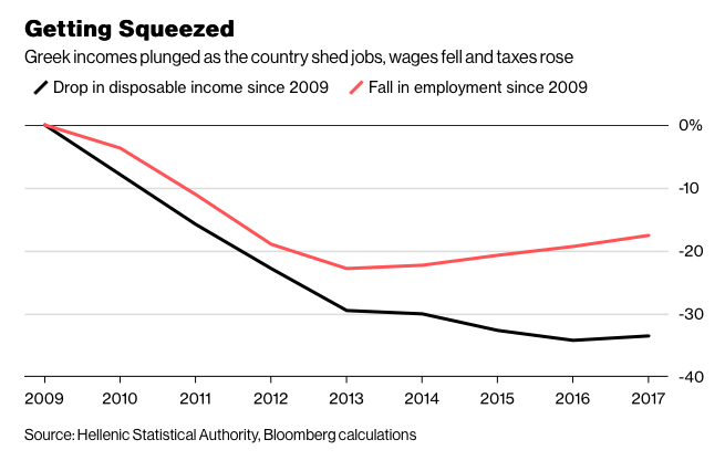 Μόνο τέσσερις οικονομίες παγκοσμίως συρρικνώθηκαν με μεγαλύτερους ρυθμούς την τελευταία δεκαετία: Η Υεμένη, η Λιβύη, η Βενεζουέλα και η Γουινέα του Ισημερινού. Το α’ τρίμηνο του 2018, η ελληνική οικονομία αναπτύχθηκε κατά 2,3% και η ανεργία μειώθηκε από το 27% στο 20%. Στους νέους ηλικίας 15-24 ετών, όμως, ανέρχεται στο 42%.
