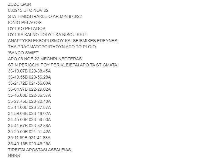 Eιδικότερα, η NAVTEX εκδόθηκε από τον σταθμό Ηρακλείου του Πολεμικού Νατικού και προβλέπει ότι από σήμερα 8 Νοεμβρίου 2022 και μέχρι νεωτέρας, δεσμεύονται περιοχές στο Ιόνιο Πέλαγος, το Δυτικό Πέλαγος και δυτικά και ανατολικά της Κρήτης, προκειμένου το πλοίο Nanco Swift να πραγματοποιήσει ανάπτυξη εξοπλισμού και σεισμικές έρευνες.