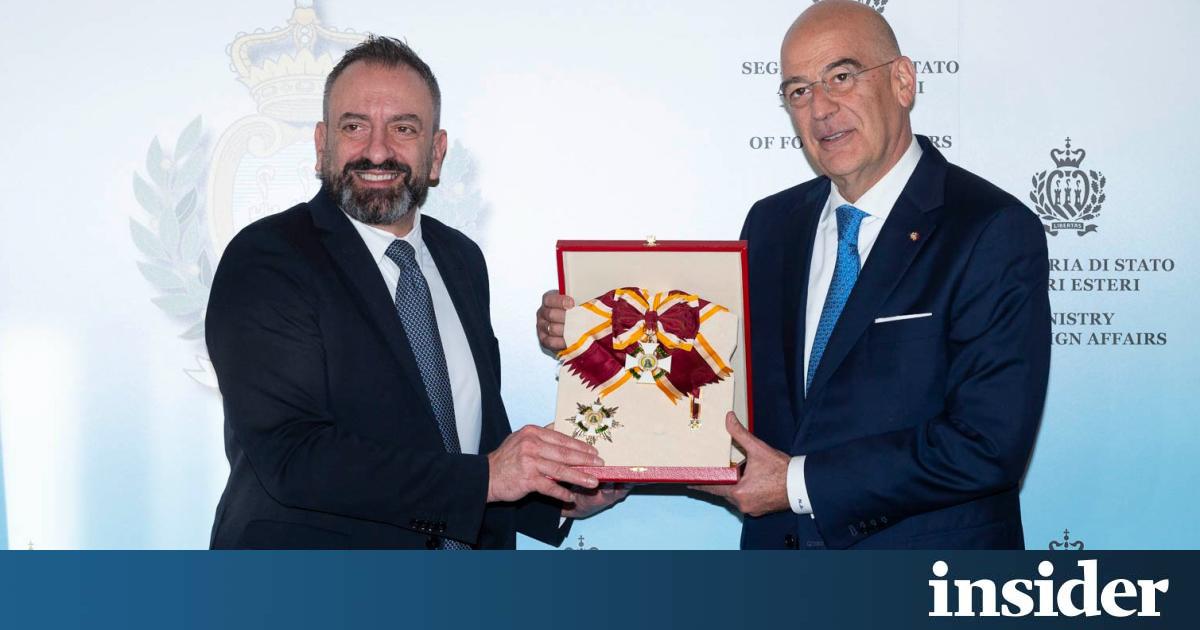 Μάλιστα, κατά τη συνάντηση με τον υπουργό Εξωτερικών του Αγίου Μαρίνου, Λούκα Μπεκάρι, ο Νίκος Δένδιας παρασημοφορήθηκε με το Μεγάλο Σταυρό Έφιππου Τάγματος της Sant'Agata (Προστάτιδας Αγίου Μαρίνου). Σε ό,τι αφορά τη συζήτηση των δύο υπουργών Εξωτερικών, αυτή εστιάστηκε στη διμερή συνεργασία, τις σχέσεις ΕΕ-Αγίου Μαρίνου, καθώς και τις διεθνείς και τις περιφερειακές εξελίξεις.